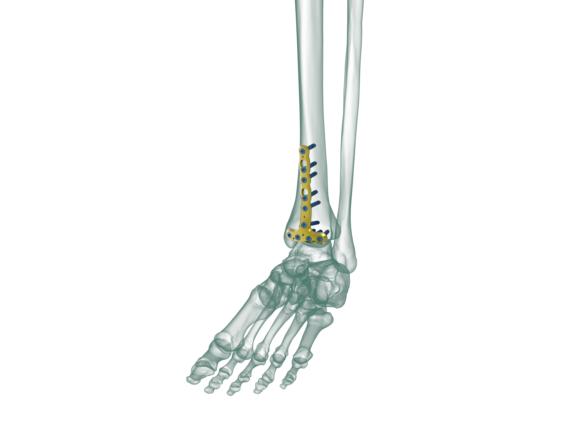 Four locking, rafting screws parallel to the joint surface along with locking, strut screw options providing additional support in the distal region of the tibia.