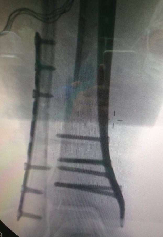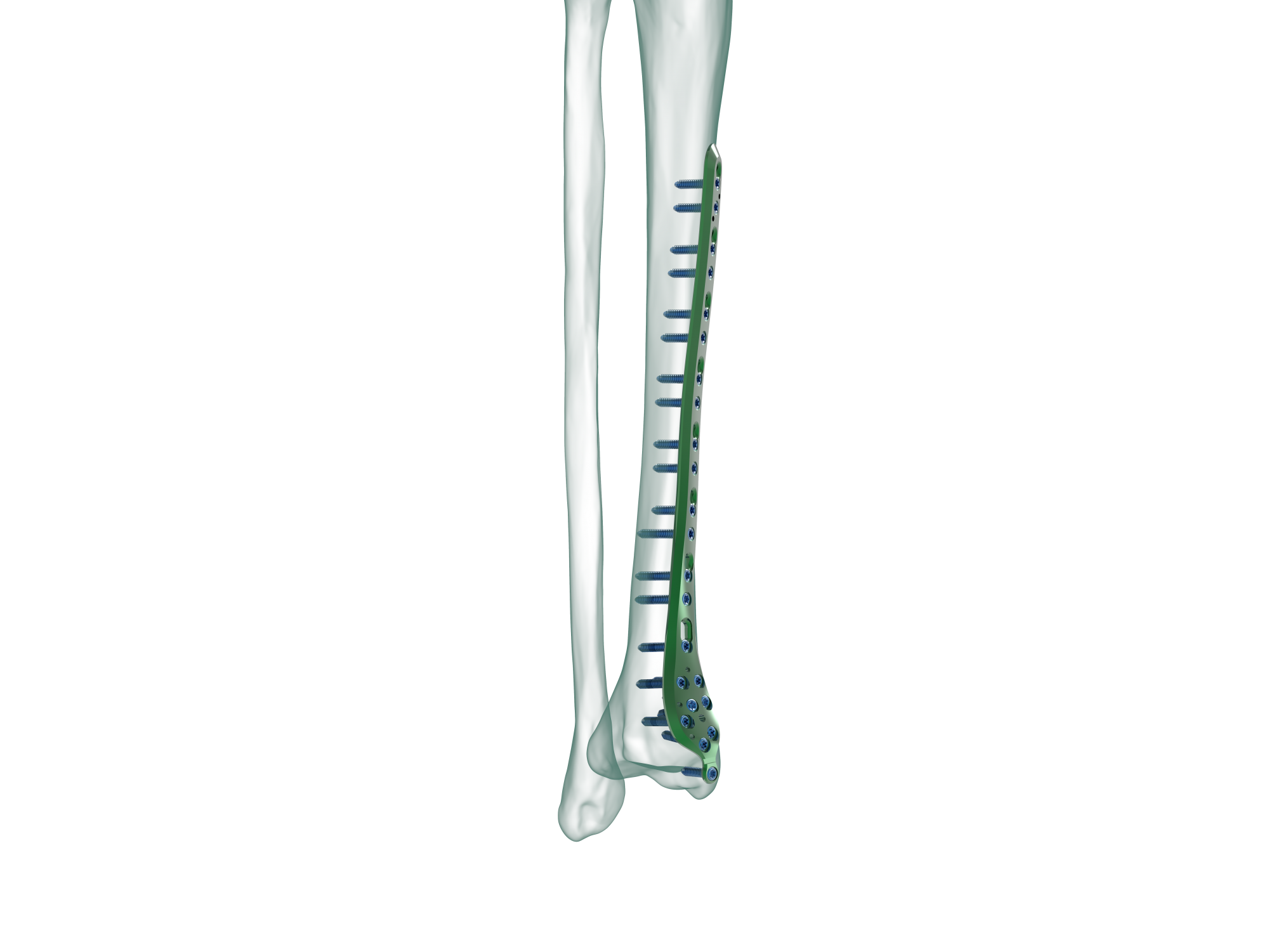 Anatomically contoured; plate is twisted 20° and bent to fit the distal tibia.