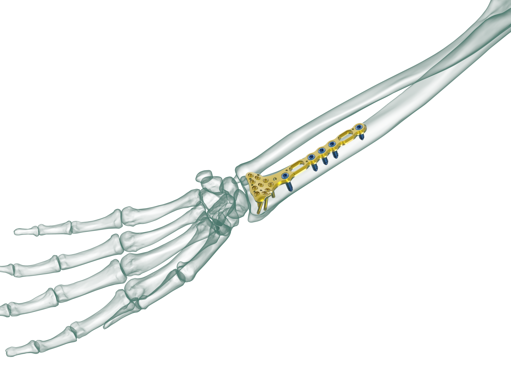 Multiple locking screw holes in the head of the plate provide additional fixation of the radial and intermediate columns, with screw trajectories designed to address a wide variety of fracture types. Specifically, two screws are angled to capture the radial styloid and prevent rotation of these fragments.