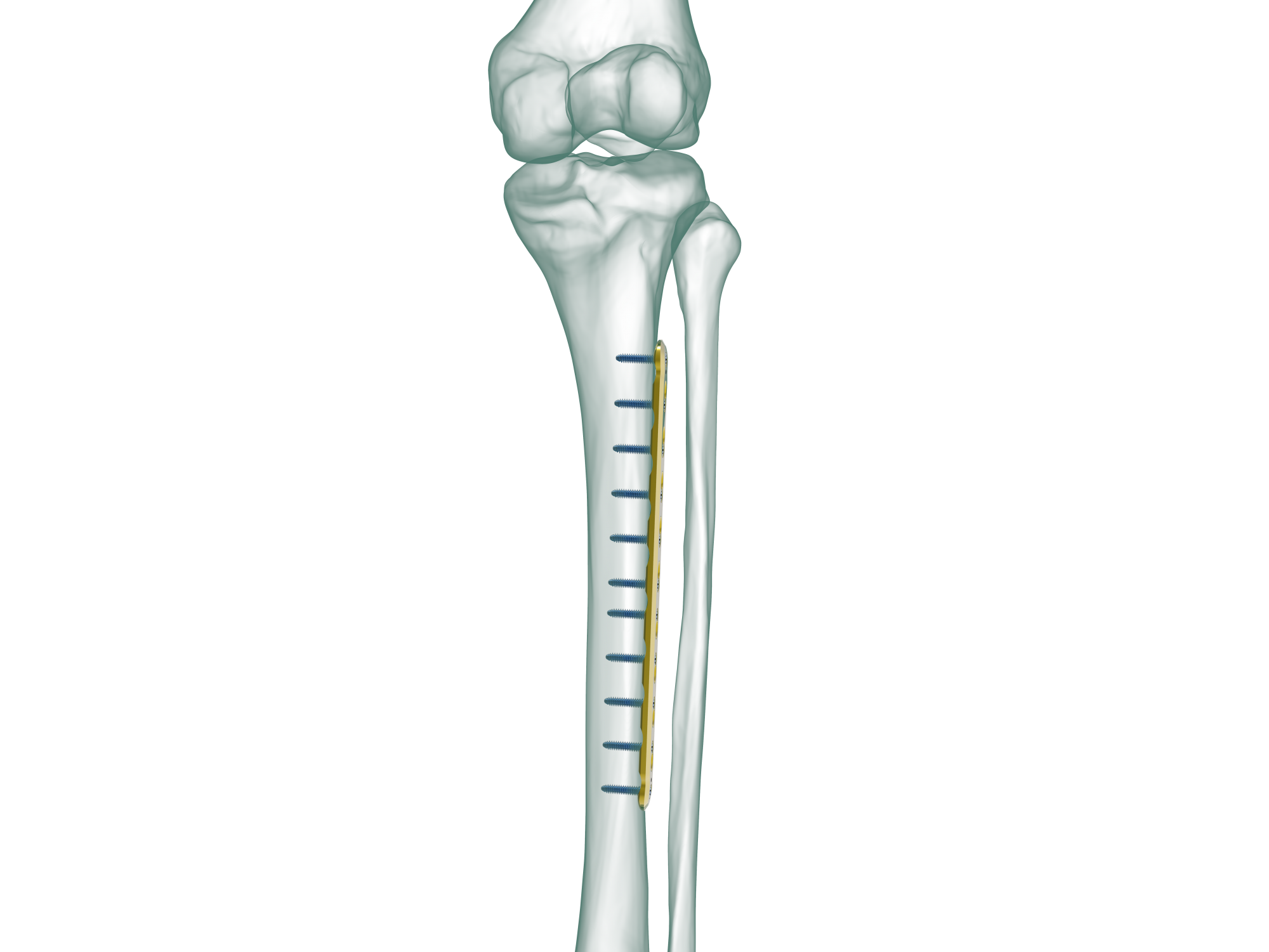 Kirschner wire holes accept Kirschner wires (up to 2.0 mm) to temporarily fix the plate to the tibia , to temporarily reduce articular fragments, and to confirm the location of the plate, relative to the tibia.